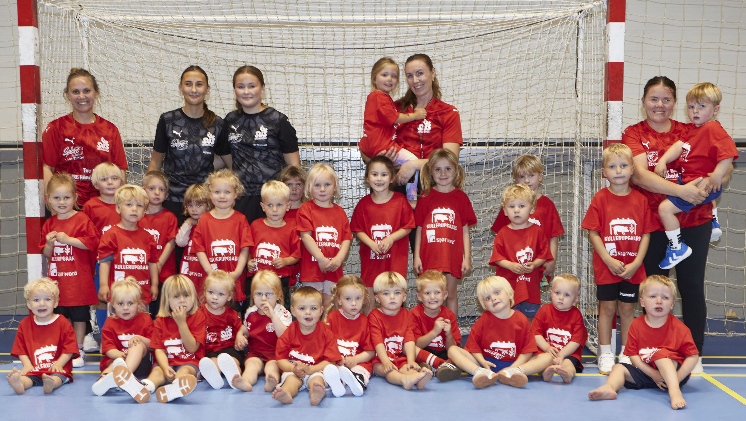 Billedet viser nogle af de ikke mindre end omkring 40 børn, som deltager i SUS Håndbolds "Trille Trolle" for børn op til 5 år. Og hvor Spar Nord er tøjsponsor.