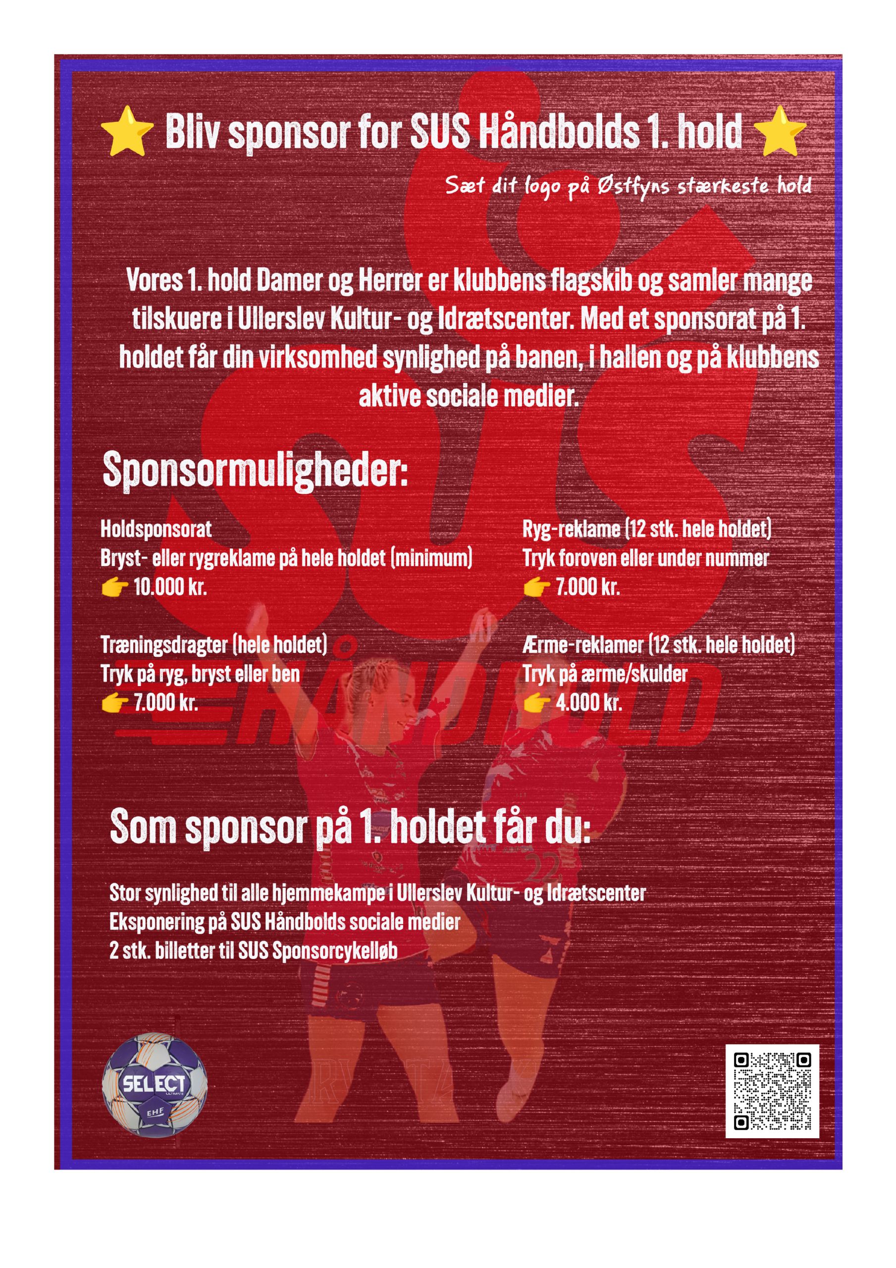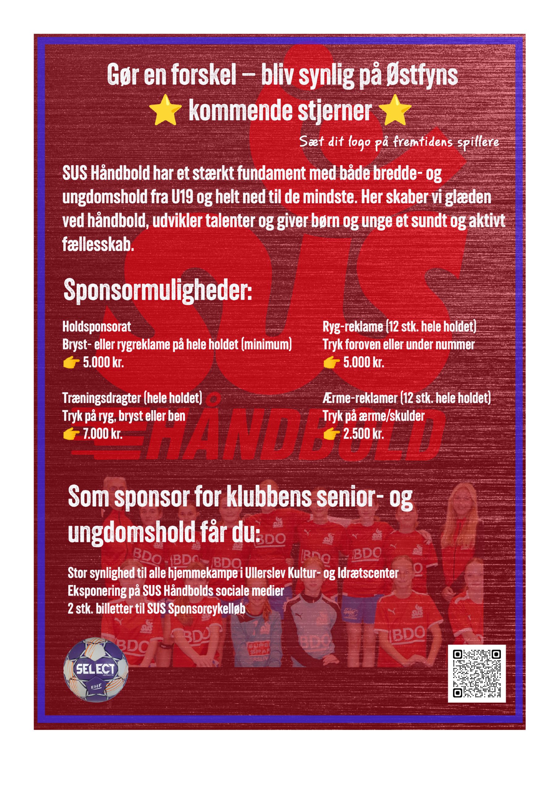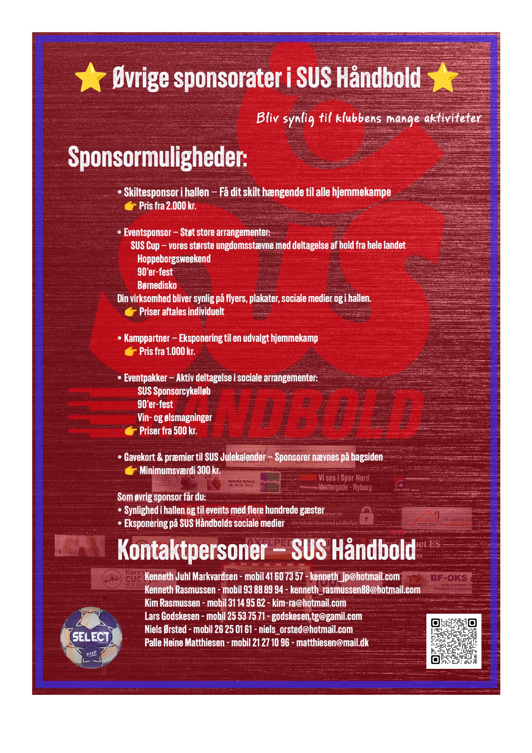 Sponsormateriale 2025 - masser af muligheder for profilering sammen med SUS Håndbold - kontakt sponsorudvalget (tlf. og adresser på side 4)!
